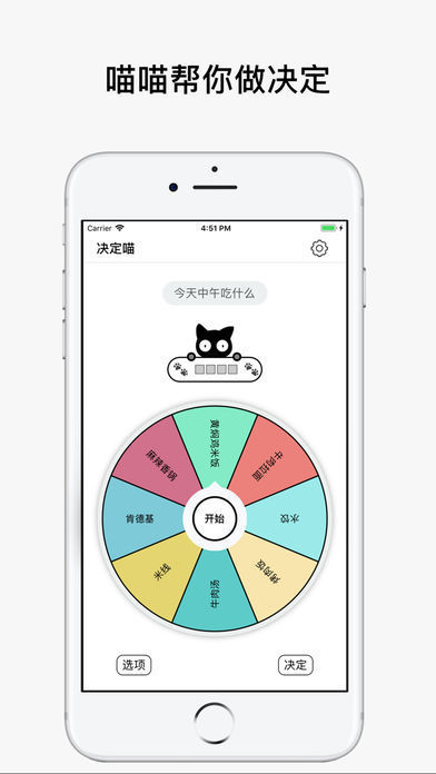 决定喵可以帮助用户很轻松地做出一些问题的选择,他用一个很简单的操作方式和一个很简单的软件界面,你可以自己选择一些合适的模板,也可以将自己喜欢的选项和方式添加进去,自由进行设置,运用多种方式决定,是你做选择一个很好的办法。