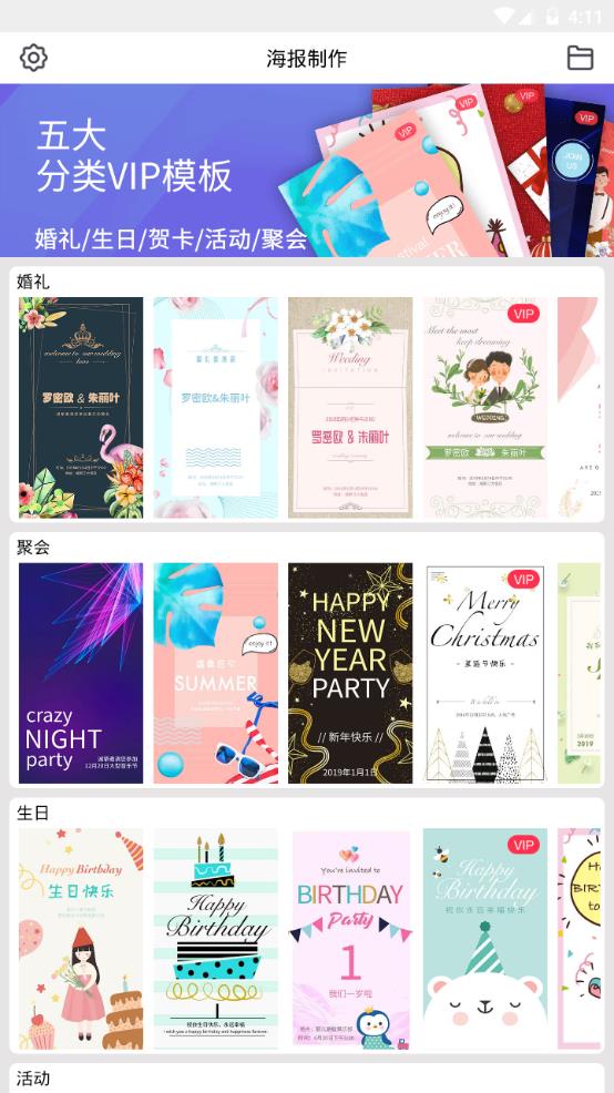 1.软件分为五个部分,用于婚礼,生日,贺卡,事件和聚会,具有丰富的模板和完整的类型。