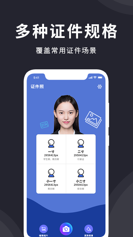 1.快速帮助用户制作所需的证件照,还可以根据需要选择背景色和尺寸。