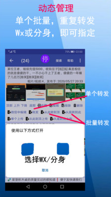 通过朋友圈,你的好友就知道自己在卖些什么东西,但是信息量众多的今天,再一条条编辑朋友圈图文信息就有些慢了,这款app就可以帮助用户一键复制内容,快速转发到自己的朋友圈中,不管你有多少个微信号,都可以用一部手机快速操作。