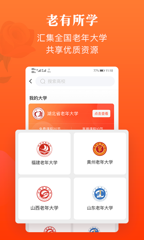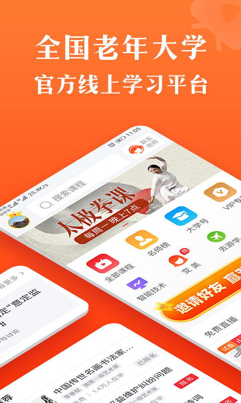 1.全国老年大学线上移动学习平台,上万优质课程随时学。