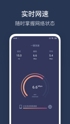 这是一款非常专业的WiFi测试优化软件,在WiFi性能测试当中有很多实用的功能,比如说帮助你一键加速,让你畅玩手机,还有智能检测的功能,以及实时网速的功能,让你随时掌握自己的网络状态,流量去哪里了,都可以通过这个软件实时的查看。