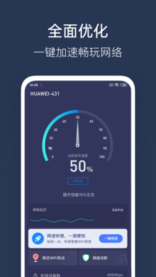 在这款软件当中可以帮助你测试WiFi信号的强弱,网络延迟等等各种情况对于很多用户来说都是非常实用的一些功能,并且如果你经常感觉到自己网速变慢了,就可以实时一键优化的功能,不仅能够提升你的网络速度,而且还能够让你解锁更多新的体验。