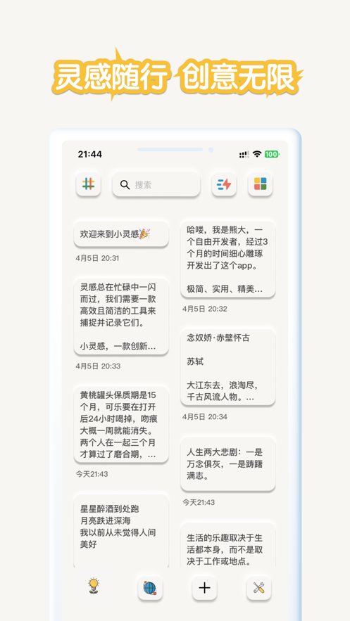 小灵感灵感笔记是一款非常实用的灵感笔记本,用户通过这款软件可以轻松的记录自己生活当中的重要事件,并且还可以在这里记录自己的灵感点滴,随时都可以在这里查看自己的记录,也可以将自己的想法快速的记录下来,各种不同的工具和功能都可以免费体验。