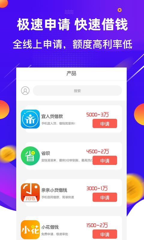 不论对于工薪阶级还是对于学生党来说,现金借款借钱这款APP都是一个非常不错的选择,没有什么复杂的操作,想要借款的时候就可以使用,拿出手机就能够完成一系列的操作步骤,还可以通过APP实时查看到自己的贷款进度,并且多种多样的产品整齐排布在主页上,选择起来更加的方便。