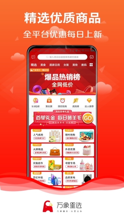 万象星选是一款非常实用省钱的购物软件,用户可以在这里体验到足不出户的购买到各种商品,所有的商品质量都是有保证的,因此可以放心购买。还可以参与到各种活动中,九块九包邮,限时秒杀,限时折扣等等,大量优惠券也可以随意领取!