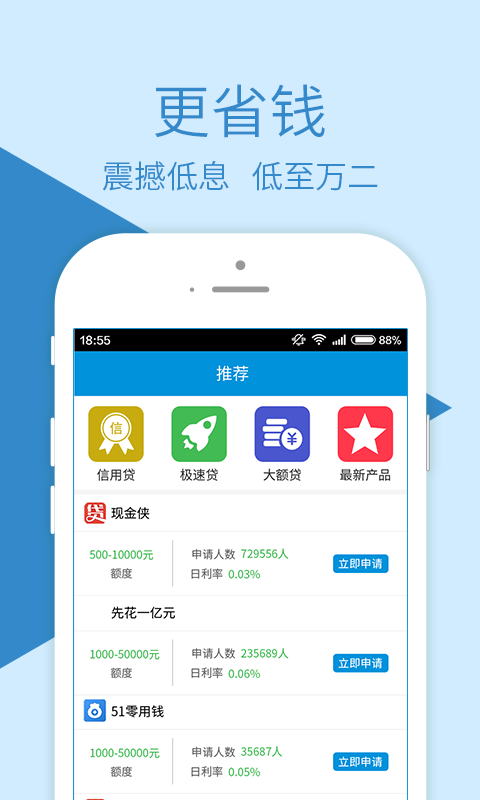 3.配额高,利息低,用户最多可以申请200,000配额,并享受最低的利息。