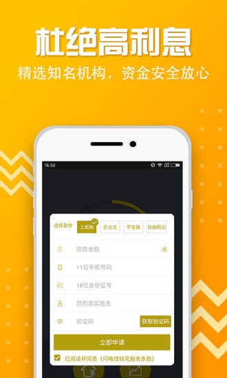 闪电借钱花仅凭身份证就可以申请1万多元的贷款,无需在此处提交其他支持材料即可申请贷款,同时这个软件不检查信用额度或芝麻点,无需面对面和其他种类的产品,只需轻按一下即可申请贷款就可以进行贷款。