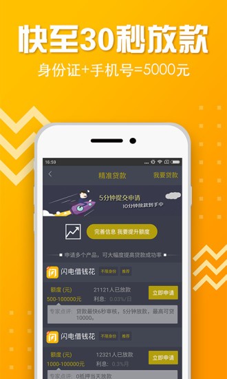 闪电借钱花简单的注册,快速的审核,用户可以在同一天进行贷款,并且通过专业的贷款搜索,同时软件可以通过用户的的个人信息和在线贷款需求与数千种贷款产品进行匹配,以创建适合用户的贷款计划并更改贷款,让借贷更加的方便。
