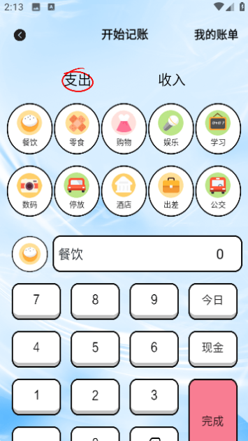 2.点击开始记账,可以选择支出类型,输入金钱数额就可以了,方便用户在总览的时候查看。
