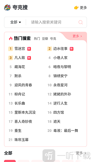 夸克搜是为大家准备的一款夸克网盘搜索引擎,在软件中有着海量的资源,无论是电视剧、电影还是小说等等,你可以直接搜索自己想要资源的关键词,也可以直接在推荐中查看近期热门的资源,并且软件的页面非常简洁,使用起来很方便。