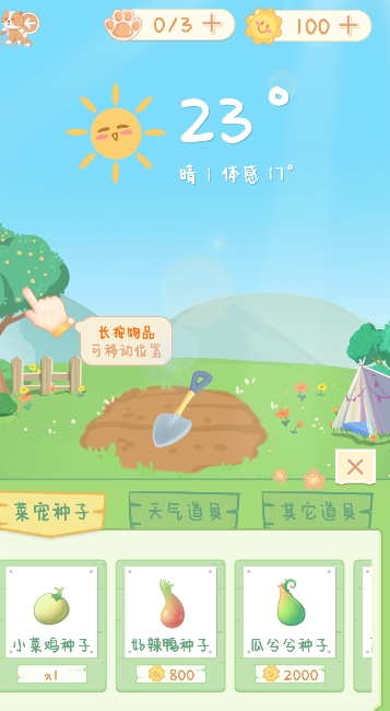 1. 唯美可爱的主页面,查看天气预报的同时还能玩小游戏,培植菜宠。