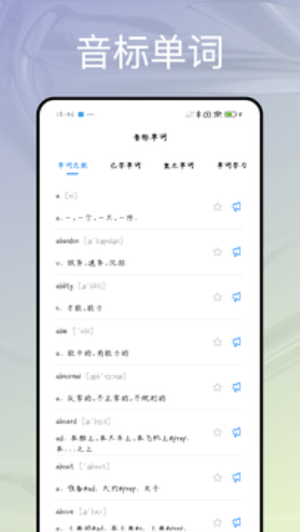 2.每个英文单词都附上了音标与中文翻译,点击喇叭图标可以学习正确的发音。