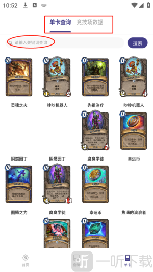 2. 点击上方的单卡查询可以查看各个卡牌的效果,也能输入关键词快速对卡牌进行筛选。
