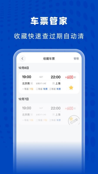 1.收藏车票:用户能够将所有的火车高铁票收藏起来,从而能够保存所有的行程车票信息。