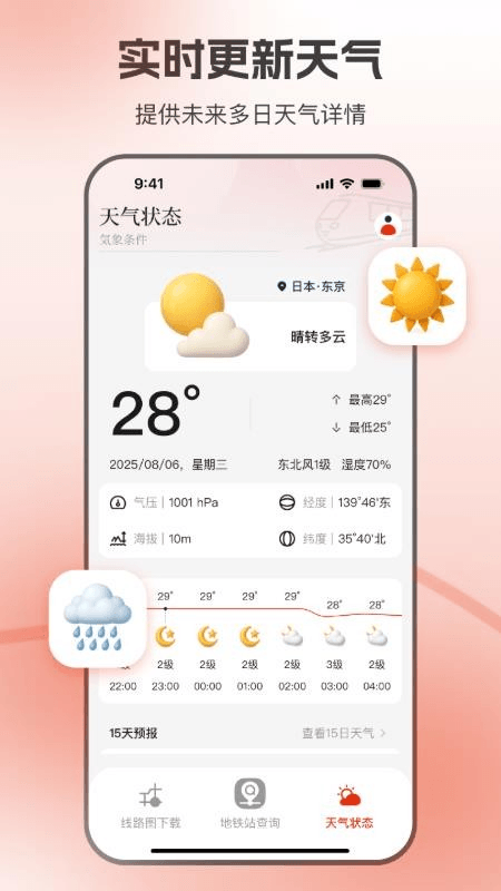 3. 实时更新东京当天及未来七天内的天气状况,甚至精确至气温、降水、风力等信息。