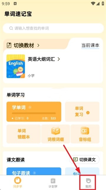 1.在同步学页面中可以了解英语大纲词汇,同时可以进行单词学习,还有课本跟读的功能
