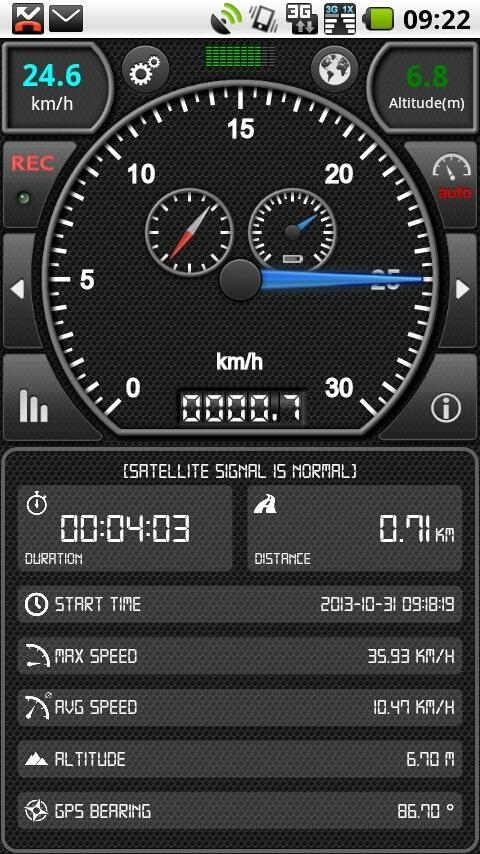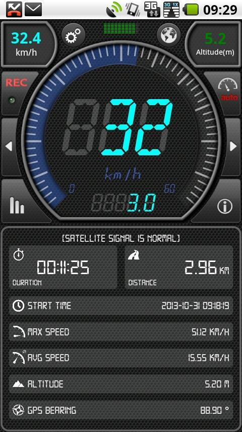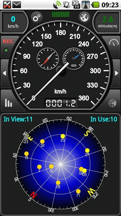 2.上方仪表盘显示实时车速和里程,下方则显示卫星分布和使用情况。