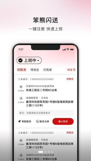 3.支持配送员在上班中和已收工状态之间切换,状态切换后界面会同步更新订单展示内容,适配不同工作阶段的使用需求。