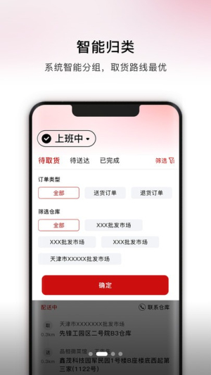 1.app会帮配送员把订单分好类,根据信息自动分组,还能规划出最合适的取货路线,让取货更快更省时间。