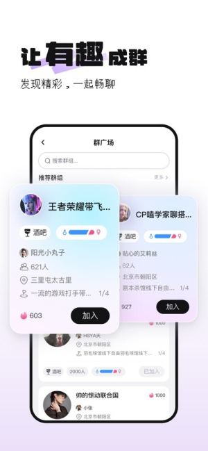 2. 兴趣活动与动态浏览,可以发现附近活动.  加入兴趣圈子、浏览关注人的最新动态丰富社交体验。