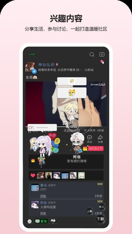 3.实时的互动模式,让你不受地区和时间的限制,随时随地与网友展开互动交流,体验沉浸式的社交模式。