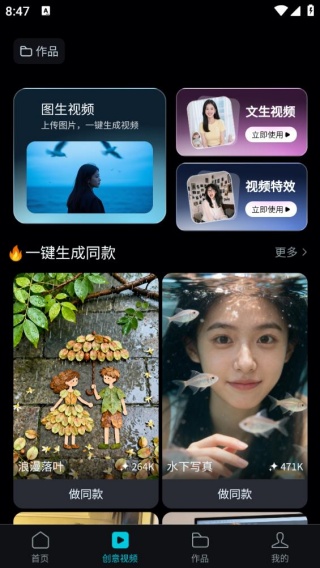 2.点击创意视频功能,内有大量视频模板,导入你的视频即可快速生成同款。