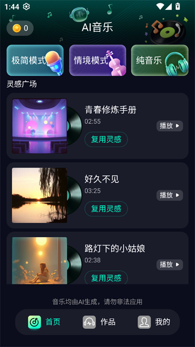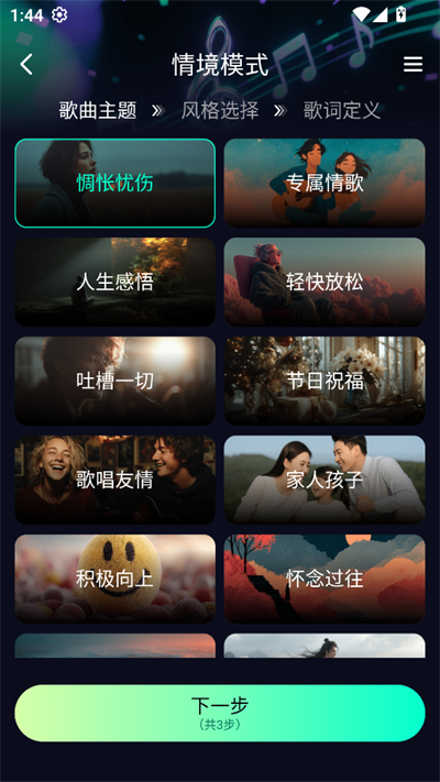 1.智能生成配乐:选择情绪、节奏与风格后即可生成可用片段,适合短视频、vlog、播客等场景快速配乐。