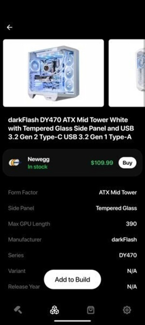 1.打开应用后点击“Add to Build”,为你的主机命名,然后进入硬件选择界面,开始挑选CPU、主板、显卡等核心组件。