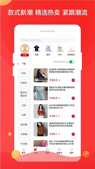 2、进行了多种服饰款式详细分类,用户可以自由进行服饰筛选加购,也可以搜索关键词搜索合适的服饰商品;