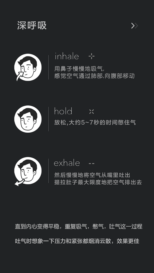 可以帮助用户舒缓心中的压力,跟随着系统的提示进行深呼吸的操作,屏幕会出现亮起和灯光的熄灭,生活中遇到让自己不开心的事情时就可以使用,不需要破坏物体,拿出手机就可以释放自己的情绪,让自己心情好起来。