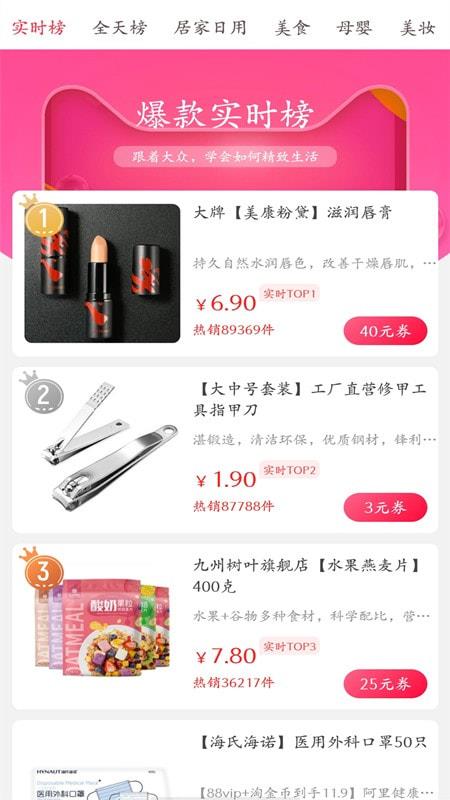 1.每一件商品的背后都有优惠券,可以领取,用户通过轻轻的点击就可领取优惠券,直接获取优惠。