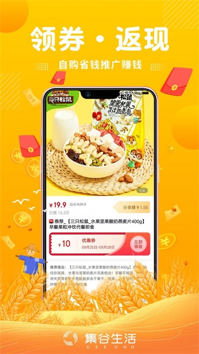 集谷生活这个应用软件中大量的商品都有很低的价格很大的折扣,通过领取优惠券还能在原来的基础上进行打折,带给你更多的实惠,所有商品都有很好的质量保证,所有厂家与软件平台合作特别的紧密,而且都是经过严格审核,没有任何资质问题的。