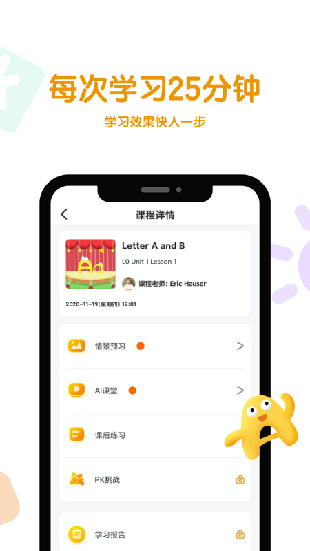呱呱蜂AI课这是一个可以给孩子们提供一个更加纯正英语教学的平台,让孩子们在启蒙的阶段就能够扎下非常坚实的基础。在将来以后学习英语的过程中能够快速的提升英语成绩。