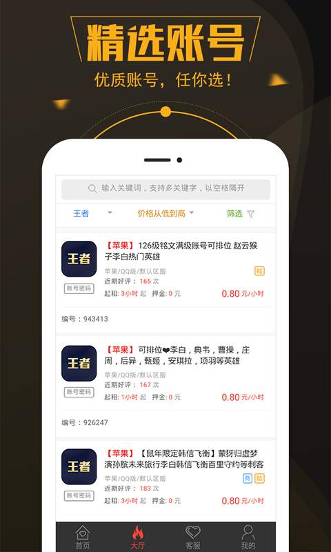在这里可以非常快速轻松地完成租号操作,并且当前最新最热的游戏都可以在平台上查看到,专门针对喜欢游戏的小伙伴打造,并且可以感受一下大神账号带来的流畅舒适感,每天都会更新许多的游戏账号。