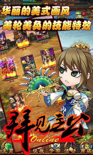 拜见主公是一款画风比较新颖的游戏,这个游戏还是很不错的,这里有很多名将,游戏的操作也比较简单,并且难度非常低,适合所有人群,游戏里面的人物都是非常呆萌的,你可以通过这个游戏来找到很多不错的乐趣,可以安利给身边的小伙伴们。