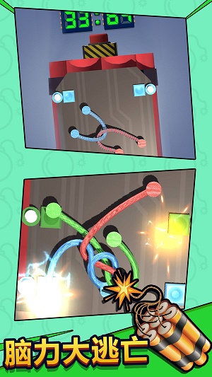 脑力大逃亡这款游戏的玩法就如同名字描述的那样,需要玩家开动脑筋,利用脑力来解决各种谜题,游戏画面色彩缤纷,各种不同颜色的绳子将缠绕在一起,玩家用手指点击屏幕来将绳子解开,如果有一丝的犹豫就会导致炸弹的爆炸,很有挑战性。