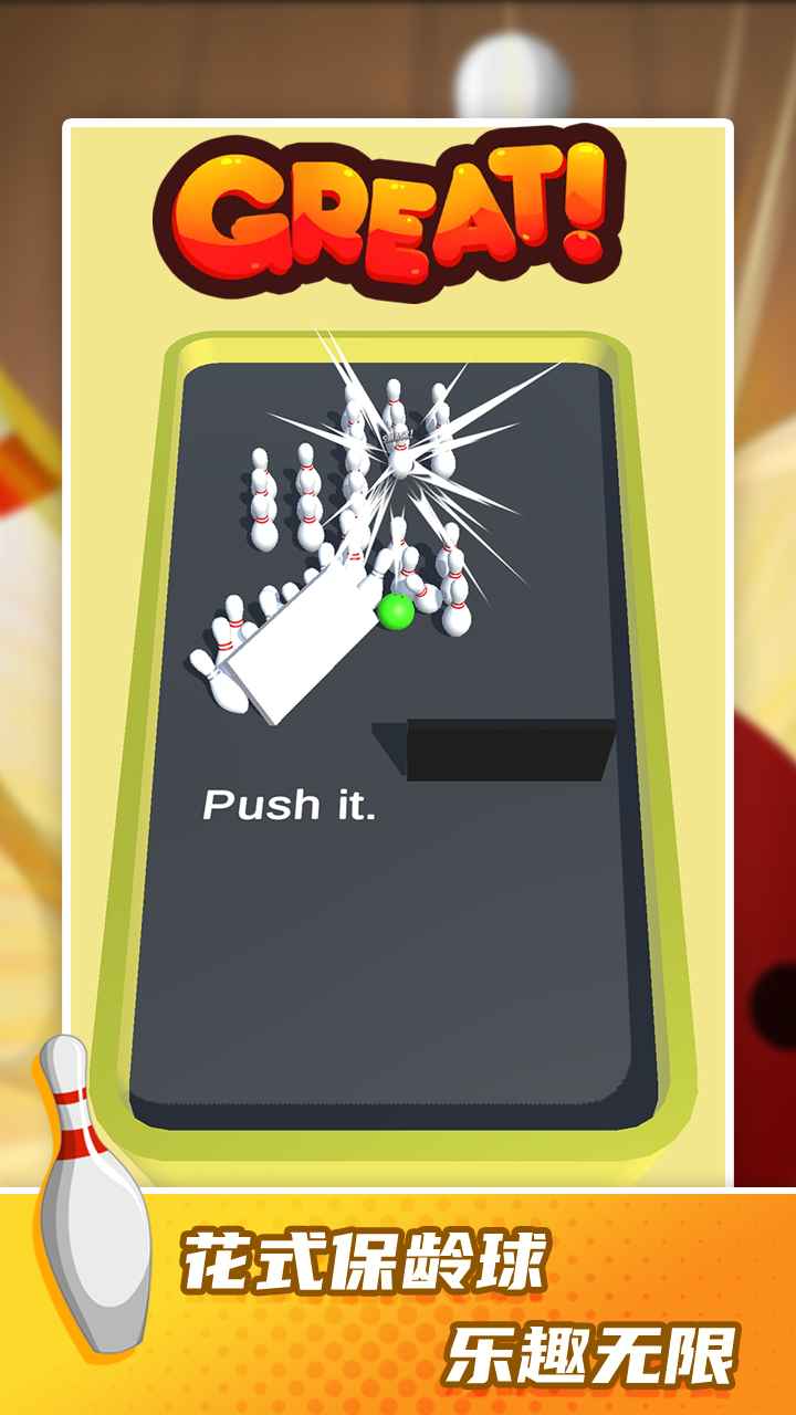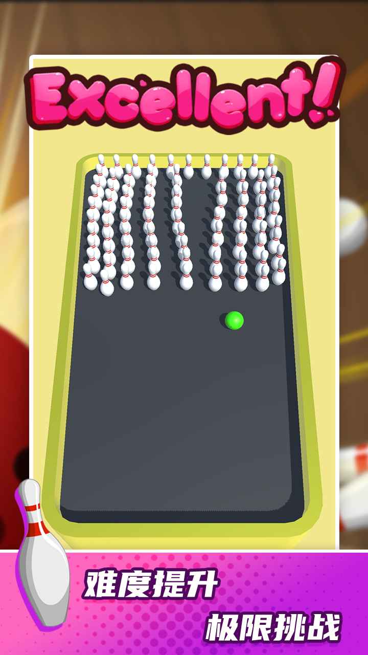 1、该游戏摒弃了传统的保龄球打法,玩法简单有趣,玩家只要用手指击倒场上所有的保龄球,即为通关。