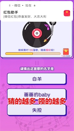 3.游戏播放歌曲序幕,让玩家猜歌曲,回答问题,答对后获得红包,顺利通过关卡。