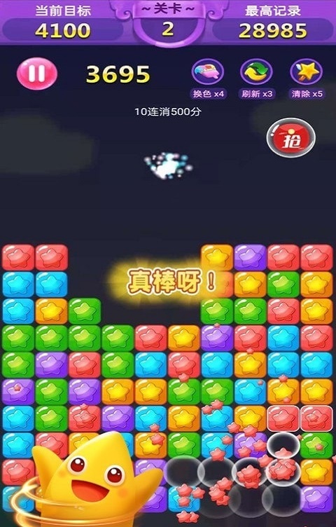 画面配色非常的鲜艳明亮,给玩家眼前一亮的感觉,适合在闲暇的时光玩耍,有助于锻炼玩家的反应能力,在游戏之中合理的使用道具也能够加快自己的通关速度,星星元素在进行合并的时候就能够产生非常耀眼的效果,还可以利用金币去解锁很多的道具。