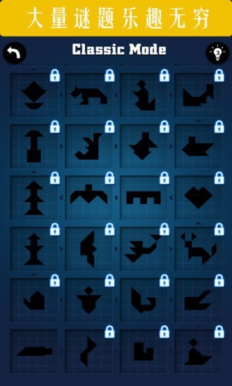 三角拼图七巧板游戏的画风是简约的卡通风格,每一个关卡都会有不同的图案,都需要玩家进行拼图,经典的玩法,会有时间的限制,移动三角图案即可开始闯关,解锁更多的关卡,带给玩家更多趣味的体验,甚至还有超多的小动物们能够进行解锁,喜欢的不要错过。