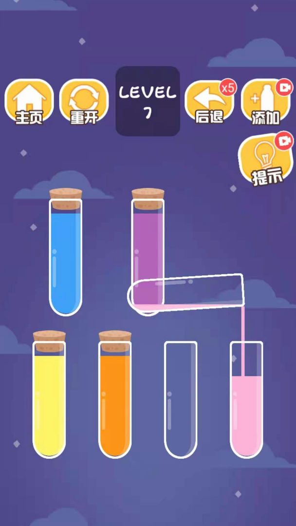 这款游戏中玩家需要对瓶子中的水彩进行分类,合理的安排正确的顺序才能够将颜色区分开,只有这样才能够轻松的过关,在这里非常的锻炼玩家的聪明才智,大家需要进行不断的思考进行不断的挑战,锻炼玩家的同时也能够考验玩家的逻辑思维能力,非常的有趣好玩。