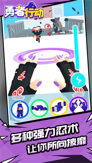 勇者行动是一款精彩的趣味闯关游戏,玩家将会拥有强大的忍术,可以进行自由结合,发挥自己的忍术技能,对敌人进行攻击,会有不同的敌人出现,使用第一人称的视角对敌人进行攻击,打败更多的玩家才能够获得胜利,每一个关卡中都会有不同的精彩内容呈现,喜欢的可以来体验一下。
