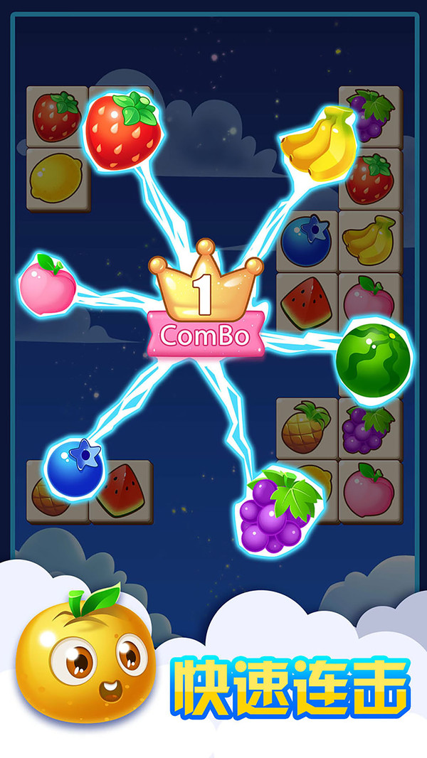 2.游戏的背景是以黑色的天空为背景,每消除一对水果,都会显示出很多亮闪闪的小星星。