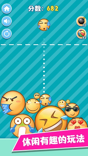 多种合成方式等待玩家尝试,找到适合自己的通关方式,帮助自己获得更高的分数,游戏中会出现越来越多的表情包,它们全部都是非常魔性的,简单的画面将使玩家将注意力放在游戏进行中,伴随着轻快的背景音乐完成游戏任务吧。
