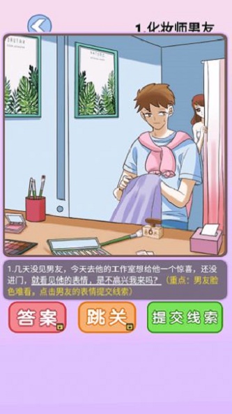 游戏采用卡通风格打造,在一定程度上减弱了紧张感,并且具有非常精彩的故事情节,需要在游戏之中分辨出渣男同时帮助自己完成任务,游戏的氛围十分轻松愉悦,每一次的选择都至关重要,渣男的特征还是很明显的,找到他们的蛛丝马迹吧。