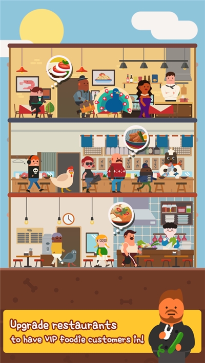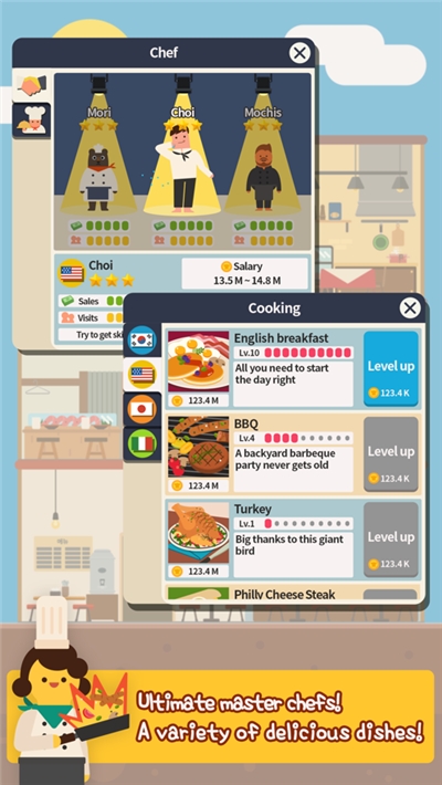 在这里你可以尽情的发挥来装扮自己的餐厅,还可以选择不同的风格,甚至是招募更多的厨师和员工,与他们一起商量薪资的发放等等,都是非常有意思的事情,你也可以在这里不断的提升自己的厨艺,研发新的菜品等等,趣味无限,喜欢的快来试试吧!