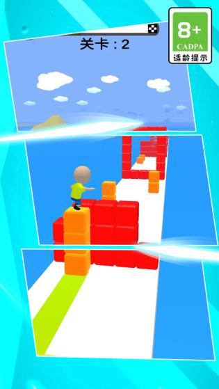 游戏的难度并不高,玩家能通过控制角色的方向而避免触碰更多的障碍,还要收集关卡中的各种方块,因为无法控制角色的行动速度,所以考验玩家的反应能力。