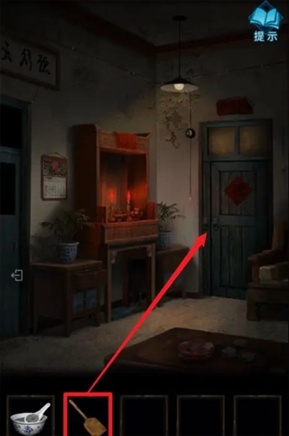 8、返回客厅,点击神龛右边的柜子,使用钥匙打开柜子,得到老虎钳