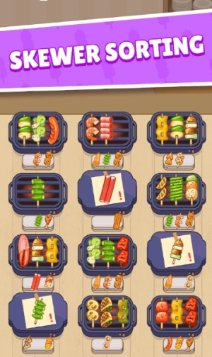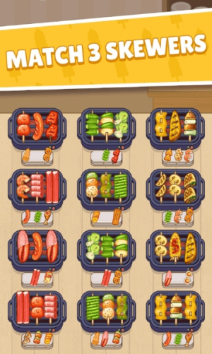 2. 玩法简单轻松好上手,只要拖动烤串到另一个烤盘上,组合成三个相同的烤串就能发动消除。